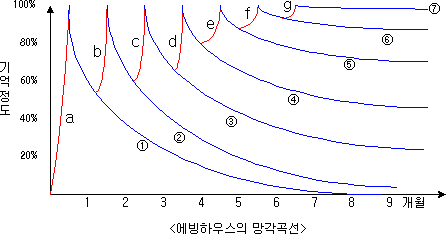 공부하는 것과 실력이 향상 되는 것이 마치 벽돌 쌓기 하는 것과 같다고 생각하는 사람들이 많습니다. 다시 말해서 10만큼 공부하면 실력도 10만큼 향상된다고 생각하는 하는데 이는 중대한 착각입니다. 예를 들어 중학생이 한달 동안 영어단어를 하루에 10개씩 외웠다고 합시다. 그러면 그 학생은 한달 뒤에는 영어단어를 300개는 외우고 있어야 겠지요? 아닙니다. 한달 뒤에 이 학생은 영어단어를 30개 정도나 외우고 있을 것입니다. 그런 상태로 더 이상 영어단어를 외우지 않고 1년이 지났다면 이 학생은 영어단어 300개 외운 것 중에서 고작 해야 3~4개 정도나 기억하고 있으면 다행입니다. 인간의 기억력은 컴퓨터와는 달라서 한번 입력된 것이 그대로 보존되는 것이 아니고 시간이 지나감에 따라서 망각하게 되어 있습니다. 여러분은 시골에서 밑에 구멍이 뚫린 시루 밑바닥에 짚을 깔고 그 위에 콩을 놓고 매일 물을 부어가면서 콩나물을 키우는 것을 보신 분이 있으실 것입니다. 콩나물 시루에 매일 아침저녁으로 한 양동이씩 물을 준다고 해도 한 양동이의 물을 부을 때 그 한양동이의 물은 전부 시루 밑으로 새어 나가 버리지만 그래도 콩나물은 자랍니다. 공부하는 것과 실력이 향상된다고 하는 것은 바로 이런 것입니다. 시루에 물을 붓는 것이 공부하는 것이라면 실력은 콩나물이 자라듯이 향상되는 것입니다. 내가 애써서 공부한 것이 몇 달 뒤에는 본 듯도 하지 않으니 “나는 아무리 공부해봐야 소용없어. 해봤자 몽땅 잊어 버리는걸”, “나는 머리가 나빠서 안돼” 또는 “이젠 나이가 많아서 기억력이 나빠졌어” 하고 생각하고는 아예 시작도 안 하거나, 시작을 했다가도 몇 달 안가서 포기해 버리는 사람들이 많습니다. 나는 이런 사람들을 볼 때마다 참으로 딱한 마음을 금할 수 없습니다. 인간의 망각은 반복으로 극복할 수 있습니다. 에빙하우스 라는 심리학자는 인간의 망각과 기억의 관계를 다음과 같은 곡선으로 설명했습니다. |